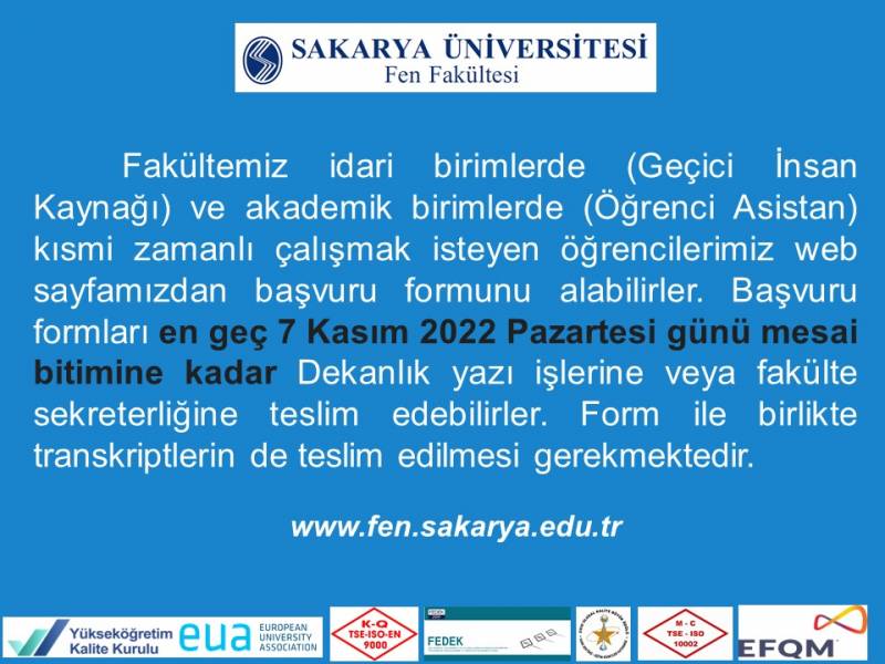 Fakültemiz idari birimlerde (Geçici İnsan Kaynağı) ve akademik birimlerde (Öğrenci Asistan) kısmi zamanlı çalışmak isteyen öğrencilerimiz ekte ki linkte Fen fakültesi web sayfasında bulunan başvuru formunu temin edebilirler. Başvuru formları en geç 7 Kasım 2022 Pazartesi günü mesai bitimine kadar Dekanlık yazı işlerine veya Fakülte Sekreterliğine teslim edebilirler. Form ile birlikte transkriptlerin de teslim edilmesi gerekmektedir. Başvuru formları 2 sayfa şeklinde olduğu unutulmamalıdır. Excell ve pdf formatlarında ayrı ayrı yüklenmiş olup istenilen format kullanılabilir.