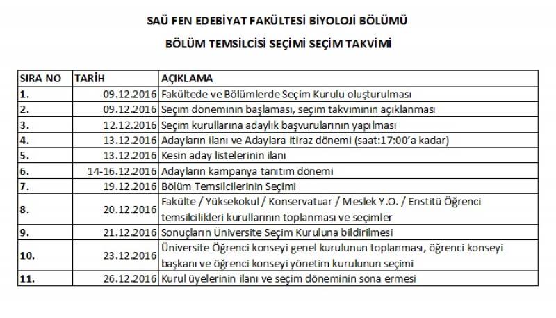 Biyoloji Bölümü Lisans ve Yüksek Lisans Öğrenci Temsilcileri seçimi yapılacaktır. Öğrenci temsilcisi olmak isteyen adayların 12.12.2016 Pazartesi günü mesai bitimine kadar Arş. Gör. Tarık Dinç'e başvurmaları gerekmektedir. Seçim takvimi ekte verilmiştir.